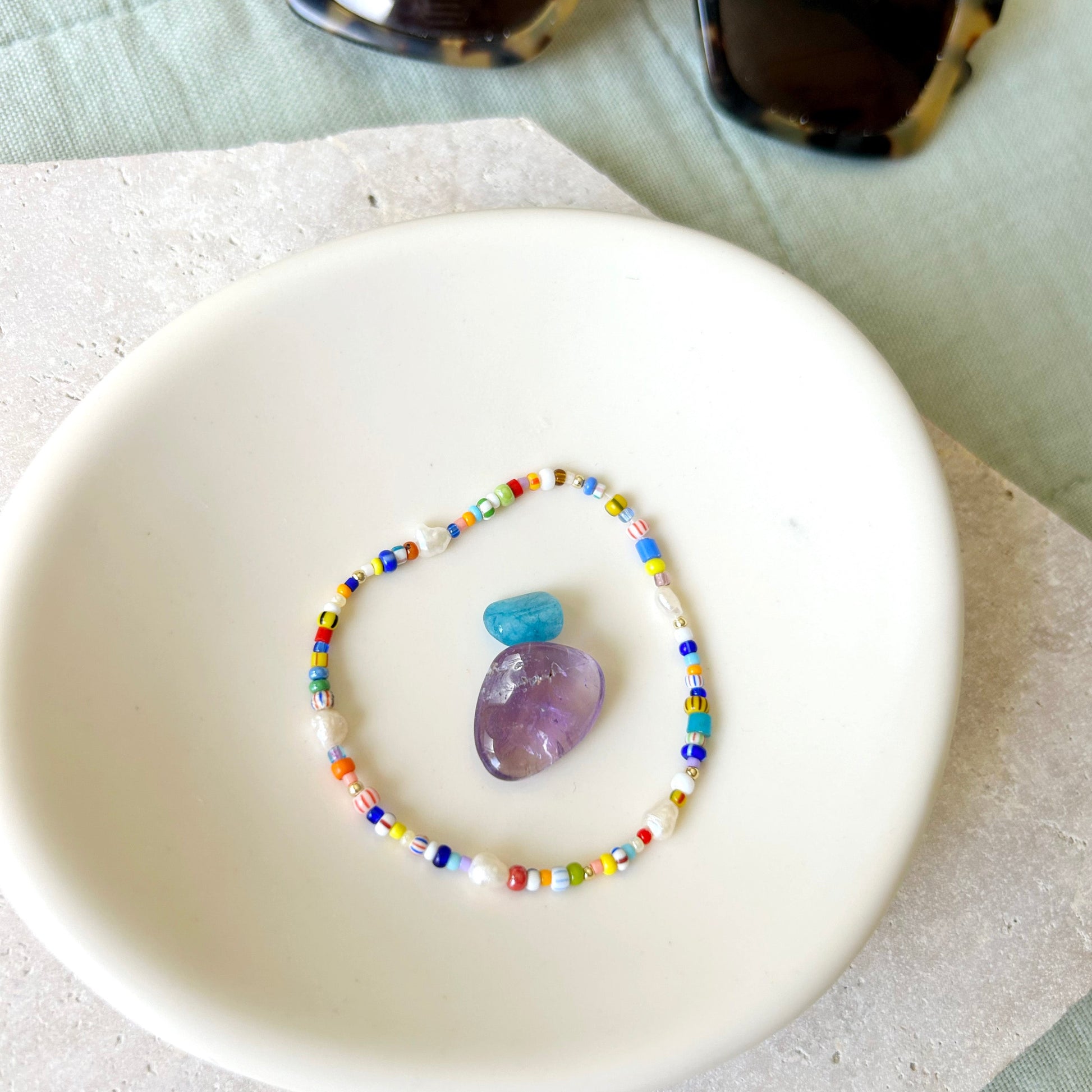 A delicate but fun striped bracelet to add to your stack. Made with Japanese and African glass beads and freshwater pearls on durable stretch nylon.