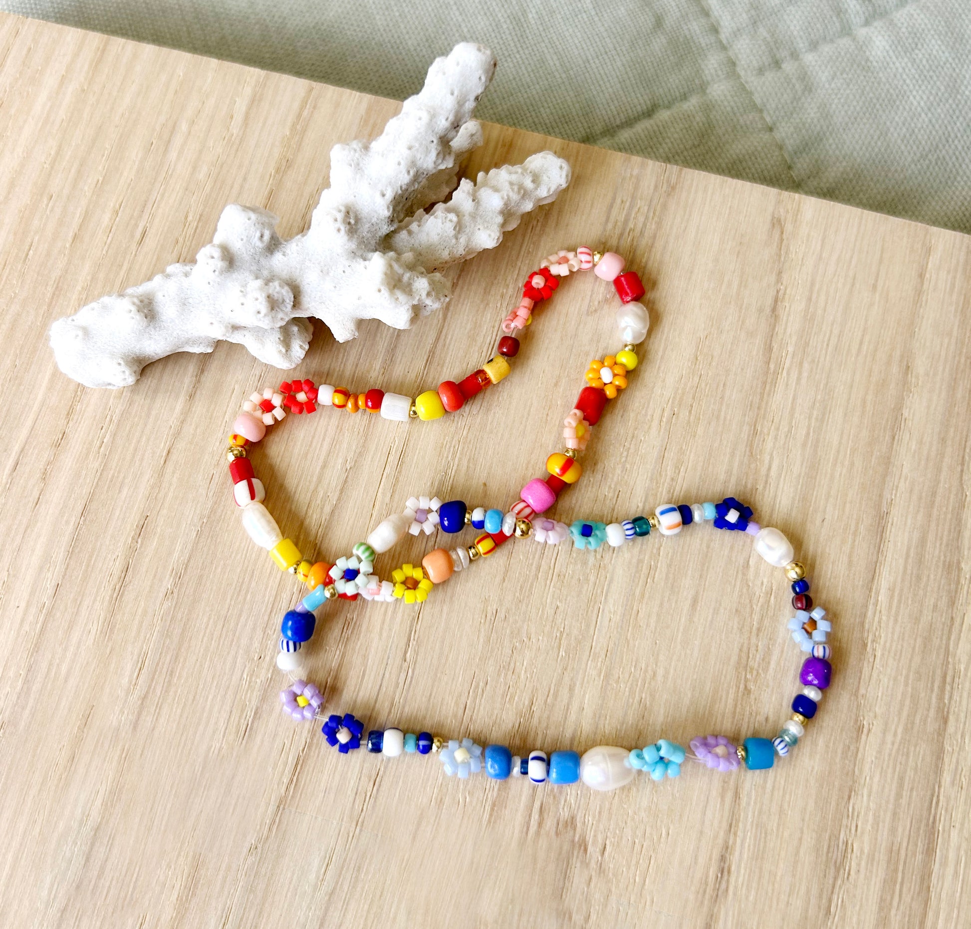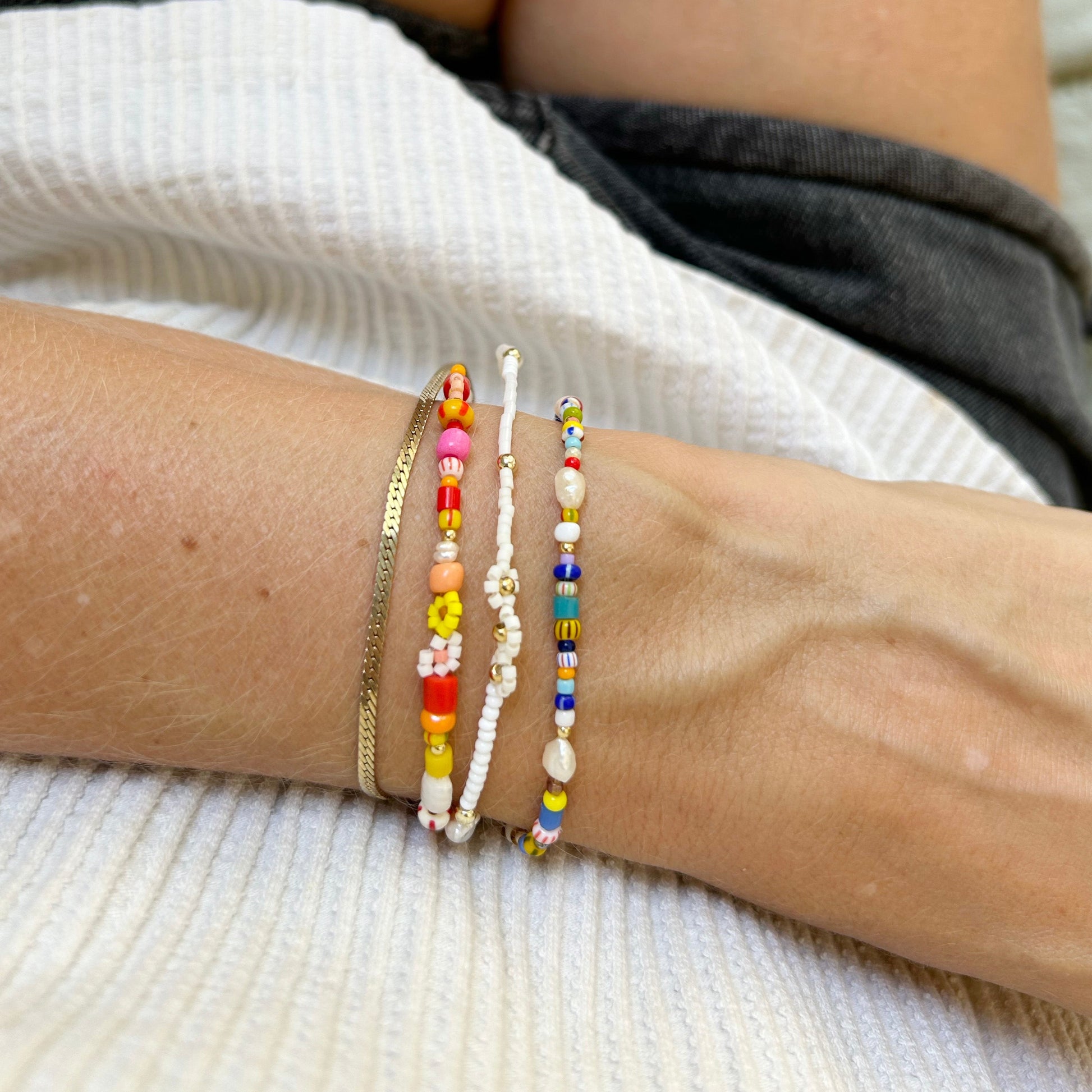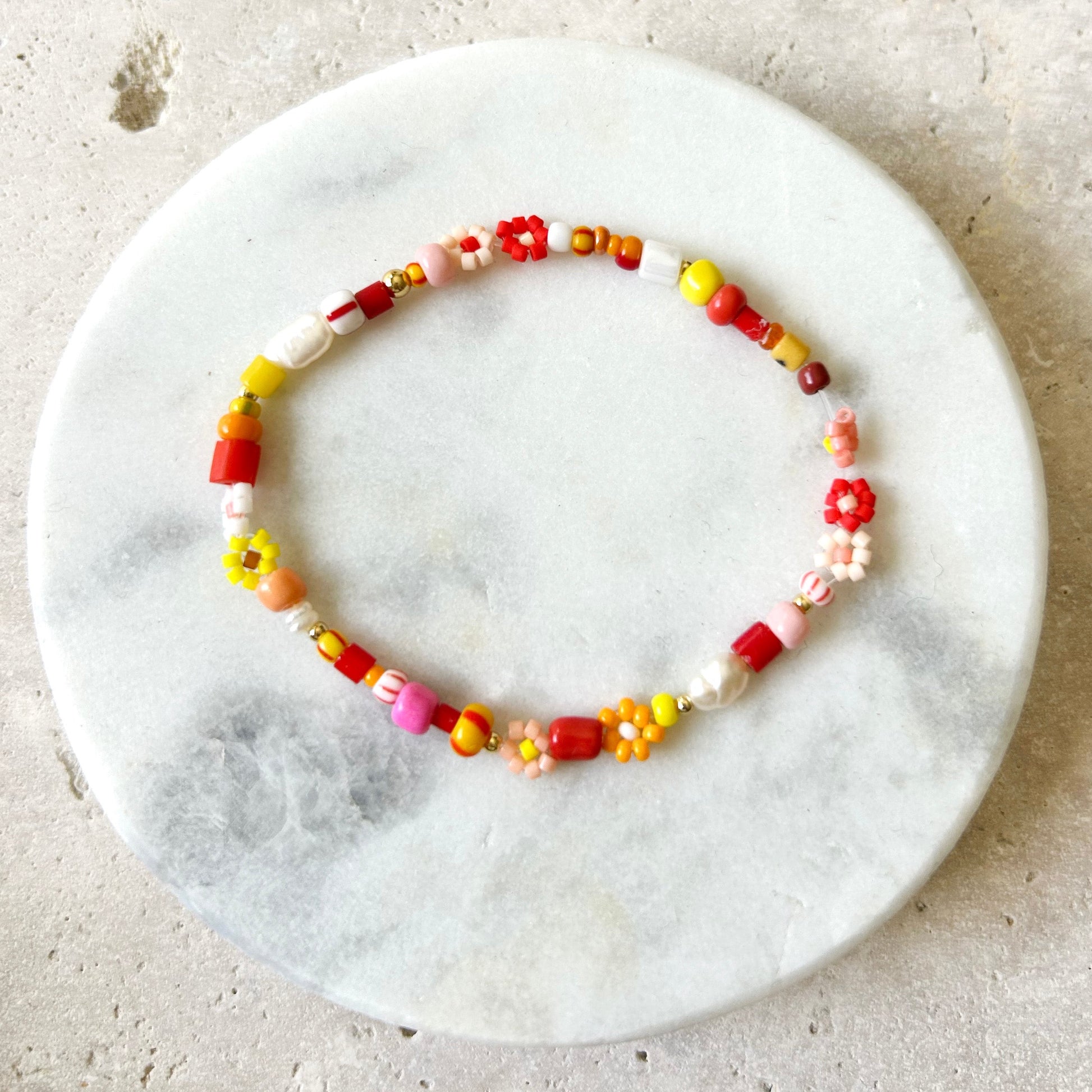 All daisies are hand made with Japanese glass beads and set with various African beads, freshwater pearls and 14kt gold beads on durable stretch nylon for easy on and off.