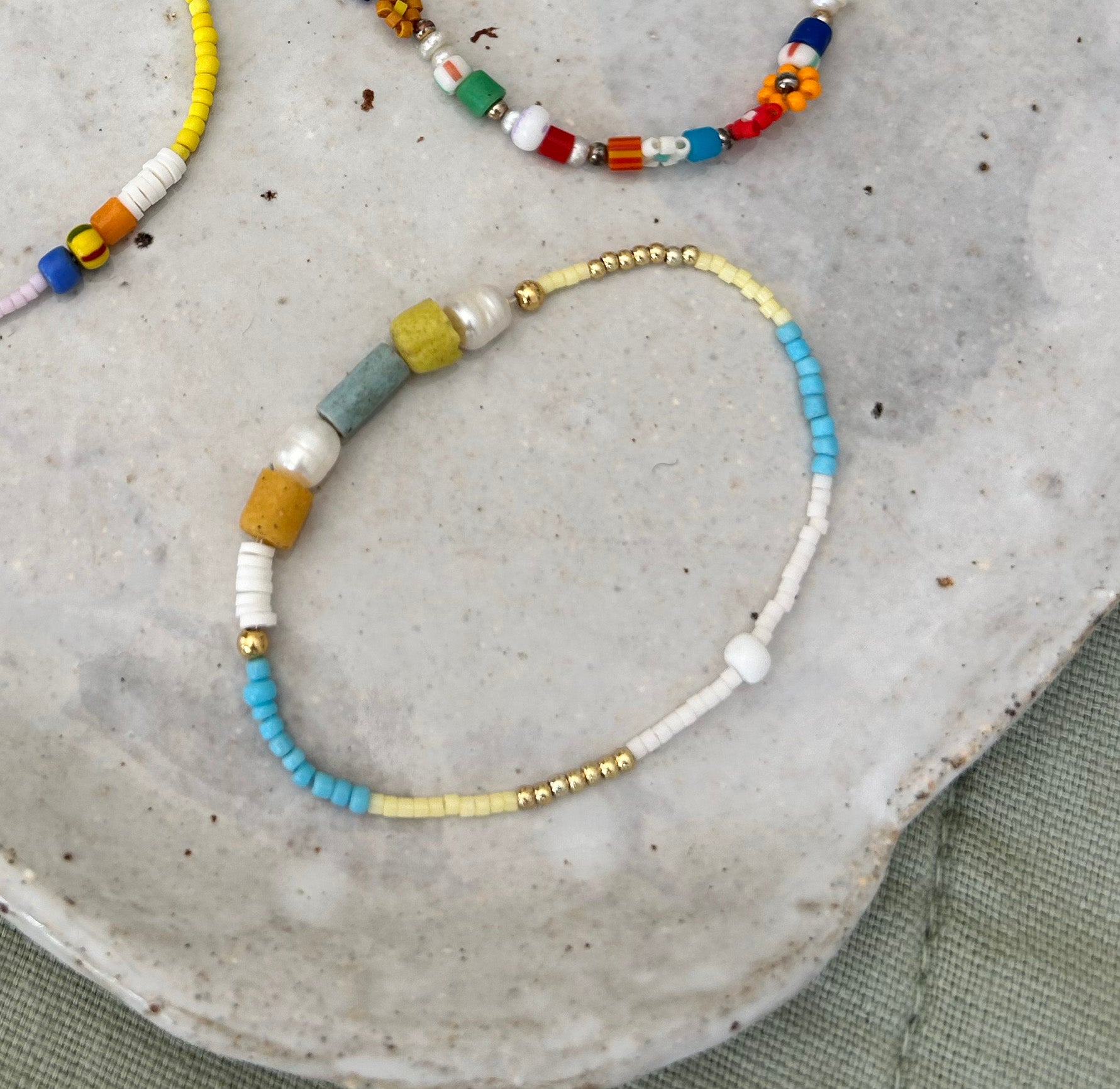 Coastal sea colourings. Unique African larger beads teamed with freshwater pearls, Japanese glass seed beads and 14kt gold filled beads on durable stretch nylon.