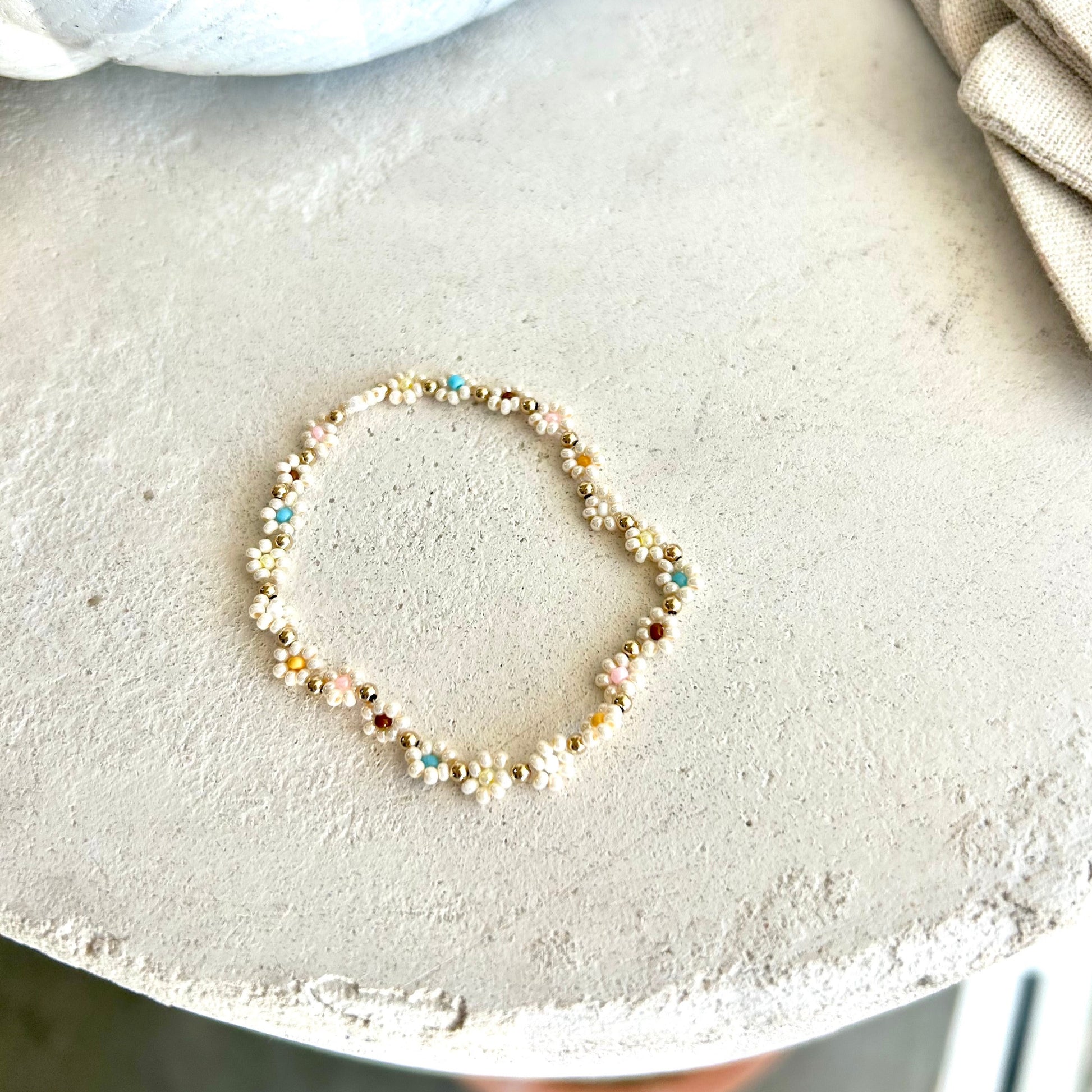 This delicate neutral daisy number is perfect for those who like things a little more classic and subtle. All daisies are hand made with Czech glass seed beads, spaced with 14kt gold filled beads on durable stretch nylon for easy on and off.