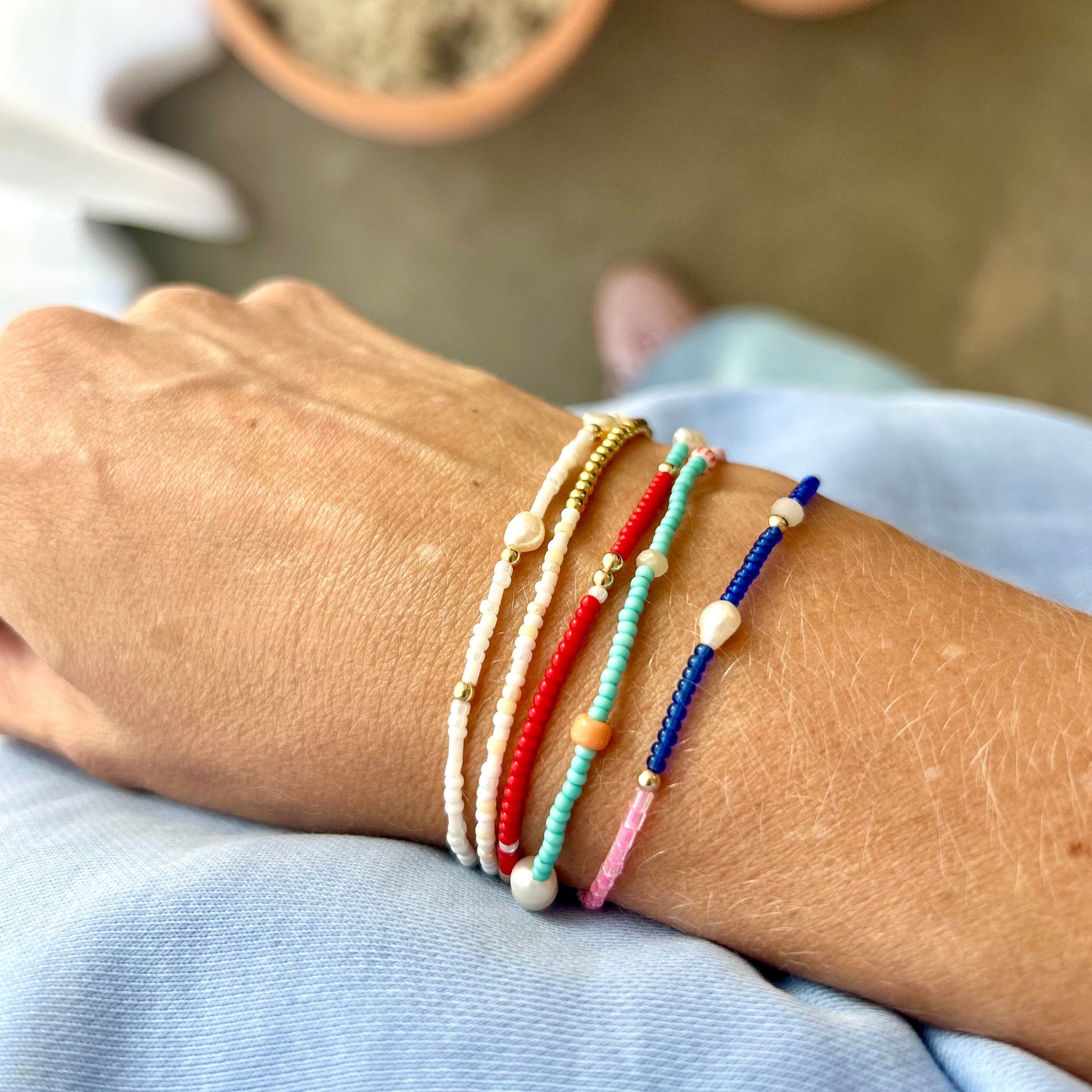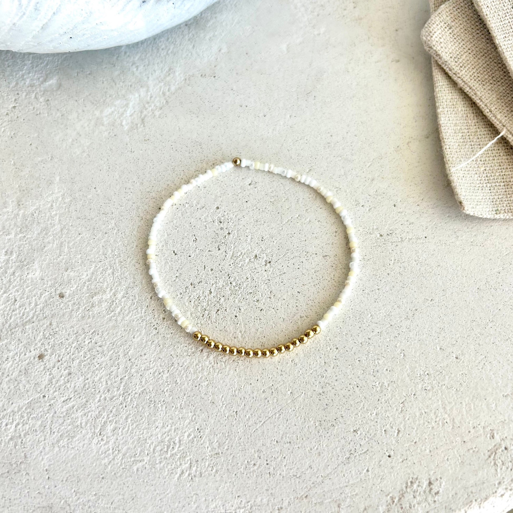 A delicate band of gold, creams and white. Made with mixed Japanese glass seed beads and 14kt gold filled beads on durable stretch nylon for easy on and off.