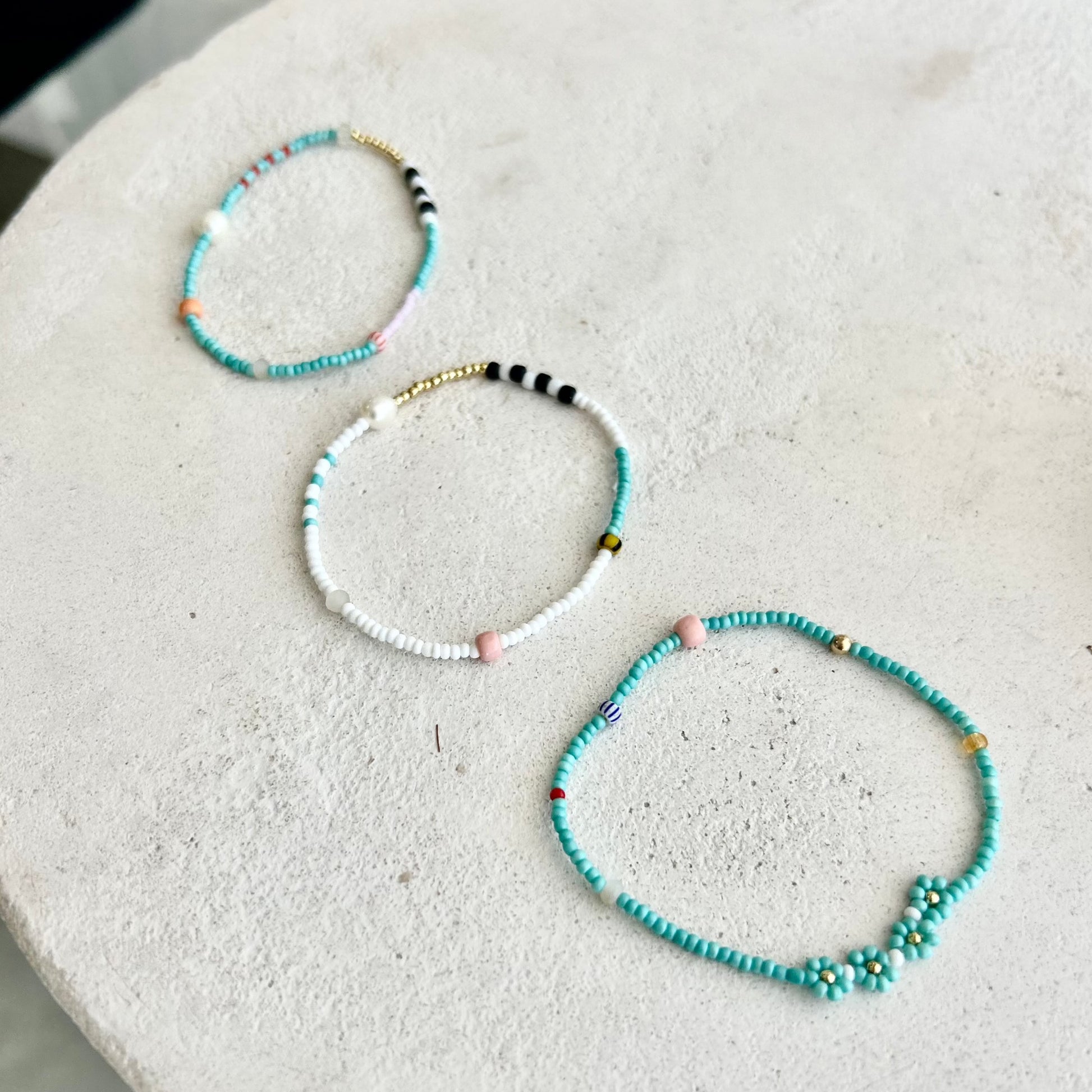 A turquoise dream with a zebra stripe. Made with turquoise glass seed beads, Japanese glass seed beads, 14kt gold filled beads, few African beads and a freshwater pearl, on durable stretch nylon for easy on and off.
