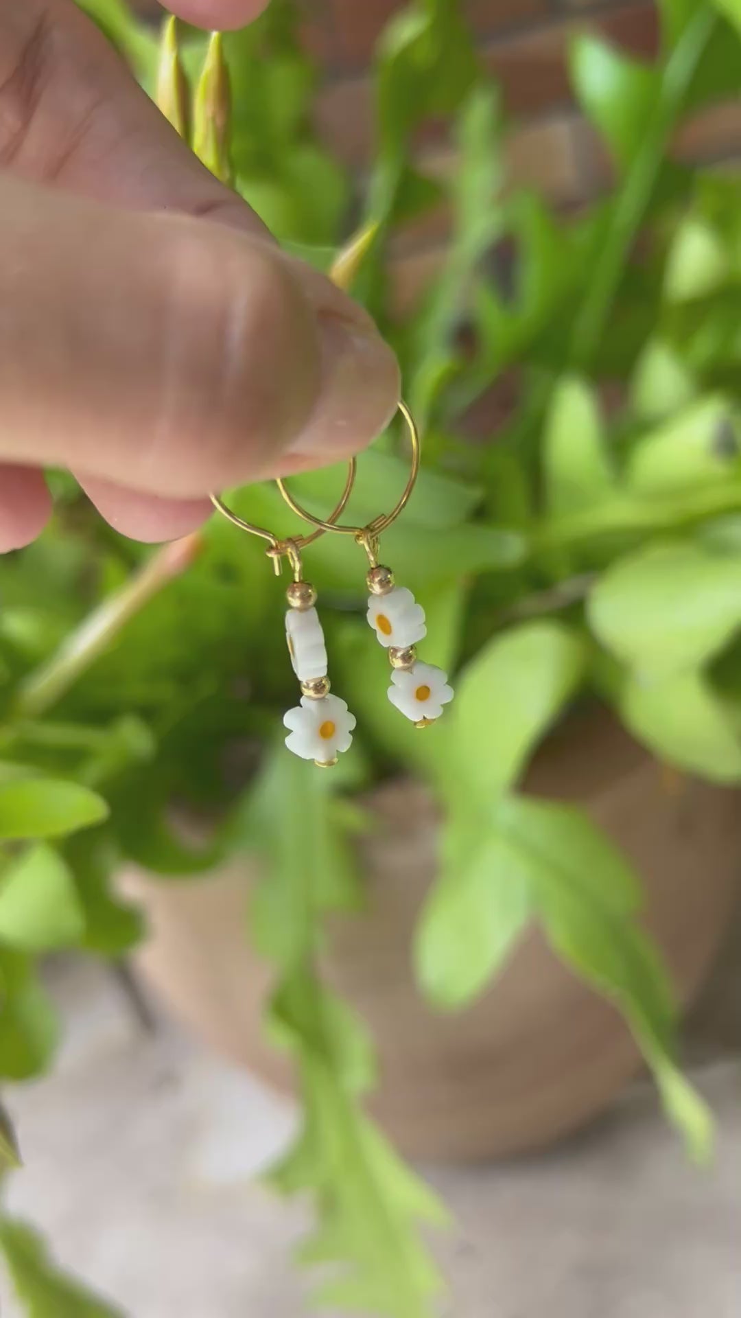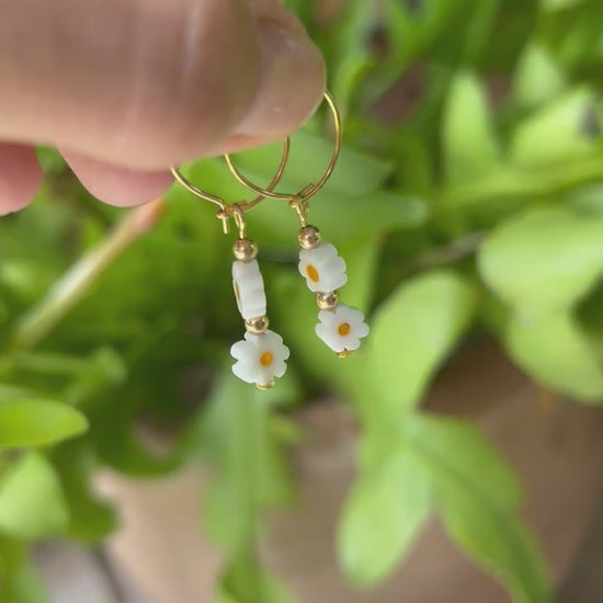 Sweet little daisies. Glass white daisies with gold filled beads on gold plated hoops.